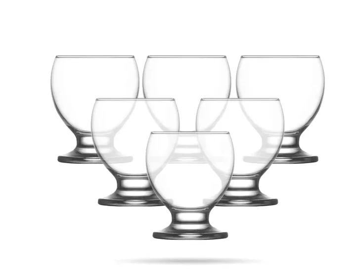 Zestaw niskich szklanek na stopce. Pucharki z serii Nectar o pojemności 215 ml marki LAV. Wykonane z solidnego szkła, osadzone na stabilnej nóżce. Klasyczne i stylowe, ponadczasowe pucharki, które świetnie sprawdzą się do serwowania różnego rodzaju lodów i innych deserów - zarówno w domu, jak i w profesjonalnej gastronomii.