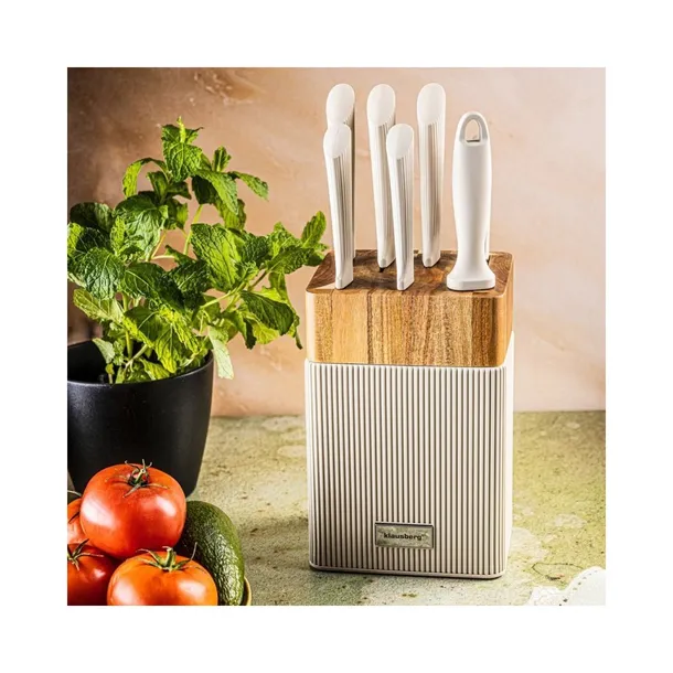 Stylowy, praktyczny i kompletny – KLAUSBERG KB-7984 to 8-elementowy zestaw noży zaprojektowany z myślą o codziennym gotowaniu i eleganckim wyglądzie kuchni. Oferuje stalowe ostrza, ergonomiczne antypoślizgowe uchwyty oraz designerski blok z elementami drewna akacjowego, który stanowi zarówno funkcjonalny organizer, jak i ozdobę blatu.