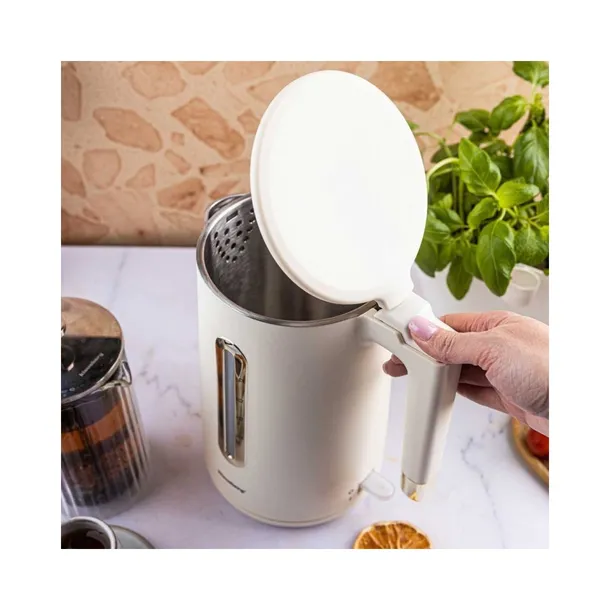 Kremowa kolorystyka w połączeniu z metalicznymi detalami sprawia, że czajnik doskonale komponuje się z kuchniami klasycznymi, nowoczesnymi oraz skandynawskimi. To sprzęt, który łączy funkcjonalność z estetyką klasy premium.