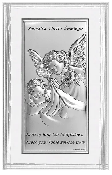 Elegancka pamiątka wykonana z najwyższej jakości materiałów – srebrny panel przedstawiający aniołka. Całość zamknięta w stylowej ramce o wymiarach 8,5 x 15 cm. Panel został zabezpieczony specjalnym lakierem, dzięki czemu pięknie odbija światło i zachowuje trwałość przez wiele lat.