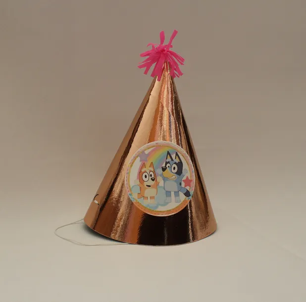 6x czapeczki papierowe pieski Blu i Bingo Bluey imprezowe różowe złoto