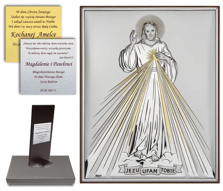 Ekskluzywny srebrny obrazek włoskiej produkcji, stworzony przez firmę , producenta srebrnych wyrobów pamiątkarskich. Obrazek przedstawia wizerunek Pana Jezusa Miłosiernego, u dołu z podpisem "Jezu Ufam Tobie". Obrazkowi niezwykłości dodają elementy w złotym kolorze.Stanowi on wyjątkowy prezent lub pamiątkę na specjalną okazję jaką jest Pierwsza Komunia, Prymicje, Ślub, lub Rocznica Ślubu.