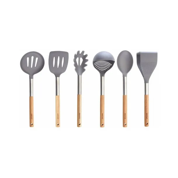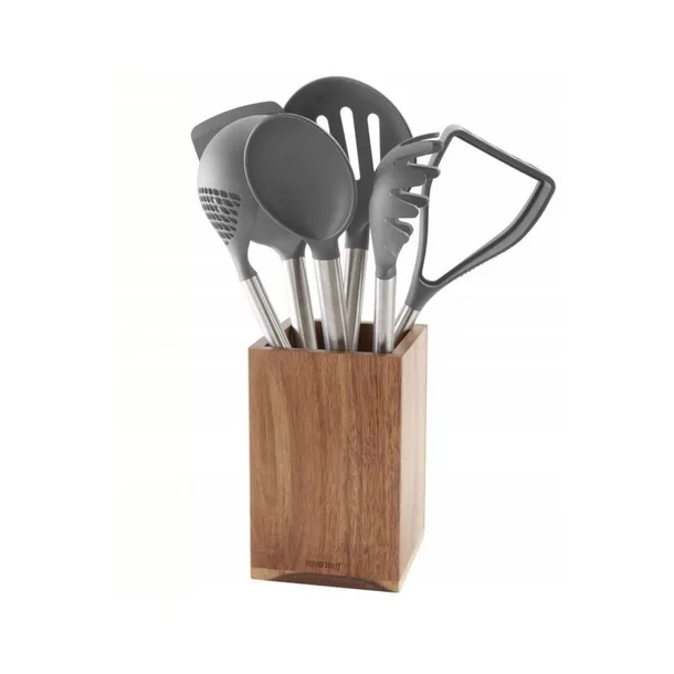 Zestaw przyborów kuchennych wykonanych z drewna akacjowego i nylonu termoplastycznego. Przybory dedykowane do naczyń z powłokami teflonowymi i ceramicznymi wrażliwymi na zarysowania.