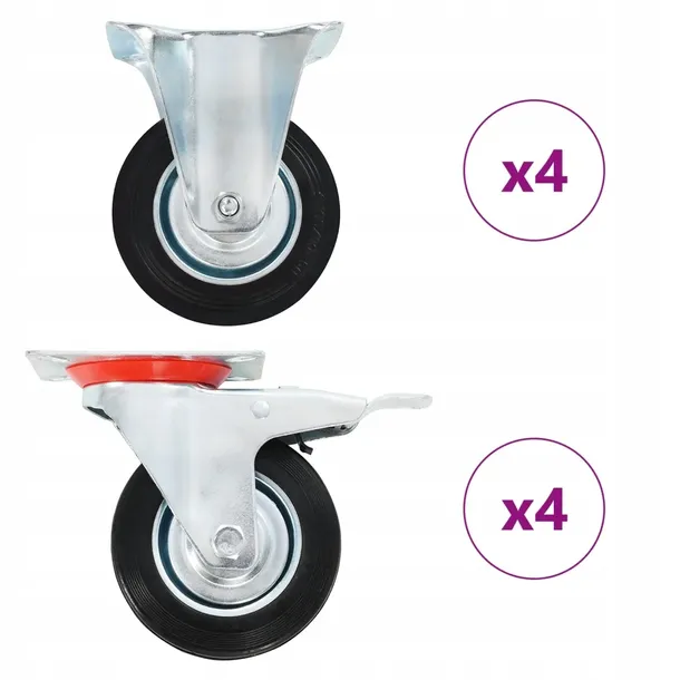 Przesyłka obejmuje 4 kółka nieskrętne i 4 kółka skrętne z hamulcami.
