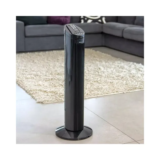 Elegancki wentylator kolumnowy z pilotem. Funkcja oscylacji powietrza podczas wentylowania bardzo korzystnie wpływa otoczenie rozrzedzając powietrze w całym pomieszczeniu. Zasięg oscylacji sięga, aż do 70 stopni.