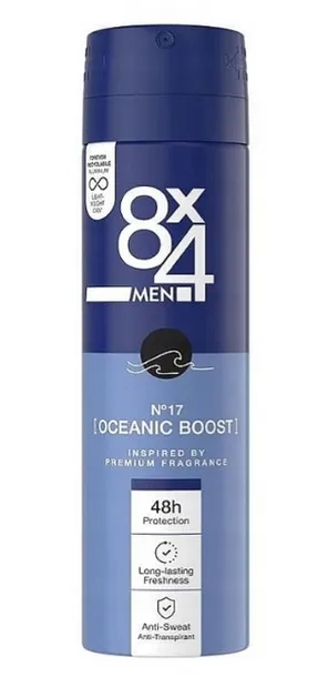 Dezodorant 8x4 Men N17 Oceanic Boost to połączenie skutecznej ochrony, pielęgnacji skóry i energetyzującego, męskiego zapachu. Odświeżająca kompozycja nut grejpfruta i mięty zapewnia długotrwałe uczucie świeżości i komfortu przez cały dzień.