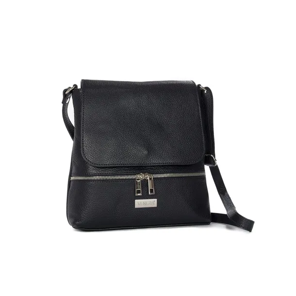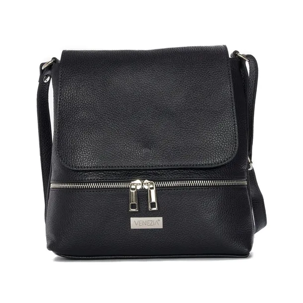 Klasyczna torebka marki Venezia wykonana z wysokiej jakości skóry naturalnej w kolorze ciemno granatowym ze strukturą groszku. Wnętrze torebki obszyte jest czarną tkaniną z logowaniem marki Venezia. Torba składa się z jednej komory. W środku znajdują się dodatkowe, małe kieszonki. Metalowe okucia są w kolorze srebrnym. Torebka posiada długi pasek z możliwością regulacji. Zapinana na zamek oraz wyposażona w klapę z napą.