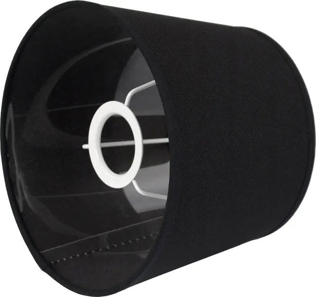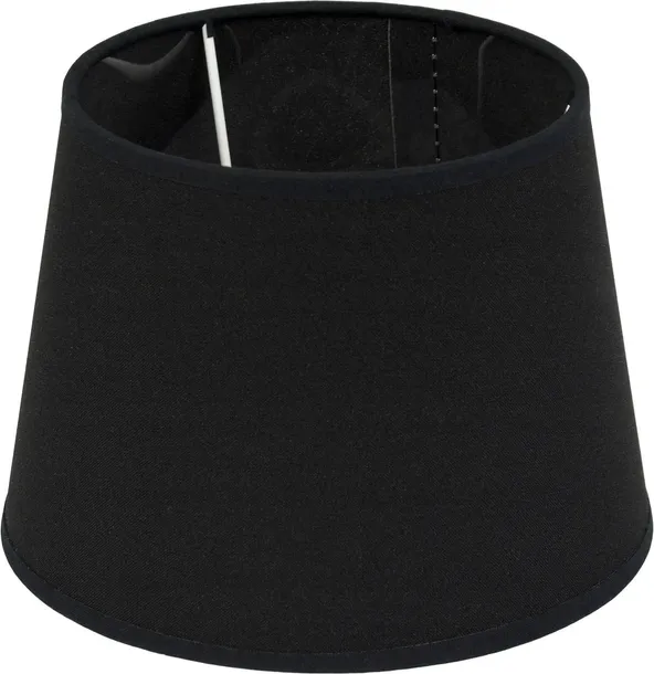 Abażur w stylu nowoczesnym wykonany z płótna bawełnianego, wykończony lamówką i usztywniony bezbarwnym laminatem. Przeznaczony do lampy stołowej. Montowany na oprawkę E27 . Kolor czarny. Wyprodukowany w Polsce.