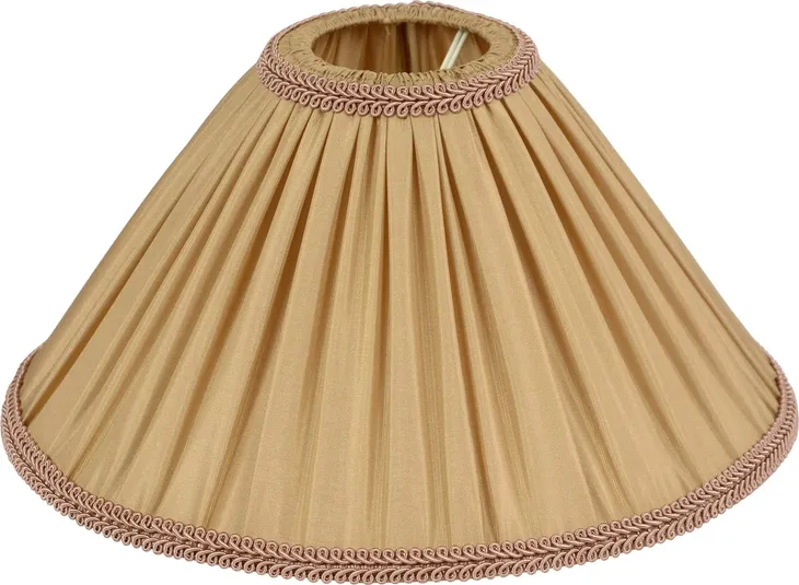 Abażur w stylu retro wykonany z wysokiej jakości tkaniny i wykończony dekoracyjną lamówką. Przeznaczony do lamp stojących. Montowany bezpośrednio na bańkę żarówki. Kolor jasno-brązowy. Wyprodukowany w Polsce.