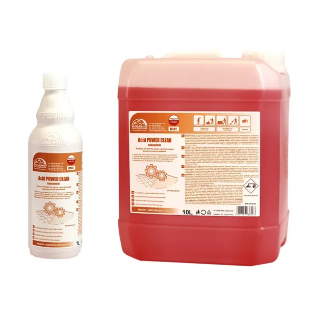 Instrukcja zastosowania: Aby uzyskać optymalne rezultaty, należy przygotować roztwór stosując zalecane rozcieńczenie podane na etykiecie produktu. Proporcje w zakresie wskazanym przez producenta, zazwyczaj od 1:5 do 1:10 (1 część detergentu do 5-10 części wody). Jeśli detergent przypadkowo dostanie się na powierzchnię, która nie jest odporna na kwasy, należy niezwłocznie spłukać ją obficie wodą. Jeśli nie jesteśmy pewni czy detergent będzie bezpieczny dla danej powierzchni, zaleca się przeprowadzenie testu w mało widocznym miejscu.
