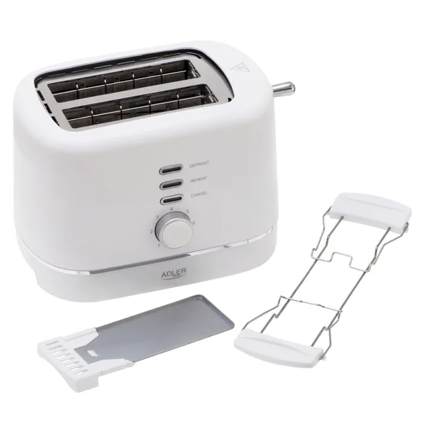 Adler AD 3224 White to elegancki, kompaktowy toster, który ułatwia codzienne śniadania i pozwala przygotować pieczywo dokładnie tak, jak lubisz. Dzięki 7-stopniowej regulacji opiekania, praktycznym funkcjom DEFROST/REHEAT/STOP oraz rusztowi do bułek, zrobisz chrupiące tosty, podgrzejesz bułki lub rozmrozisz pieczywo prosto z zamrażarki – szybko i wygodnie.