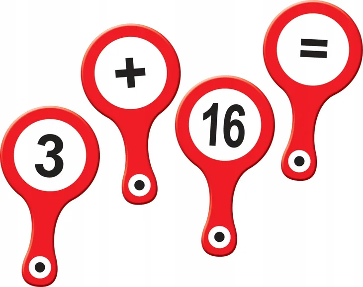 Zestaw zawiera: plakietki z cyferkami i działaniami matematycznymi.