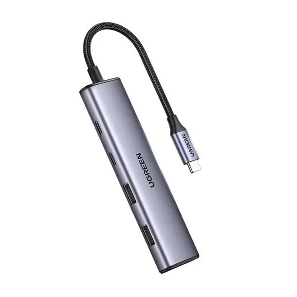 Producent UGREEN Model CM473 Wtyczka USB-C Porty 2x USB-C 3.0 + 2 x USB 3.0 Długość przewodu 20 cm Prędkość transferu do 5 Gb/s Kompatybilność Windows, Linux, Mac OS, iPad OS itp. Materiał Stop aluminium