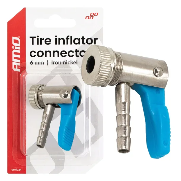 Profesjonalny adapter do kompresora wykonany z wytrzymałego stopu żelaza pokrytego warstwą niklu, gwarantujący wysoką odporność na korozję i uszkodzenia mechaniczne. Przeznaczony do precyzyjnego i bezpiecznego podłączenia przewodu powietrza o średnicy 6 mm do zaworu opony.