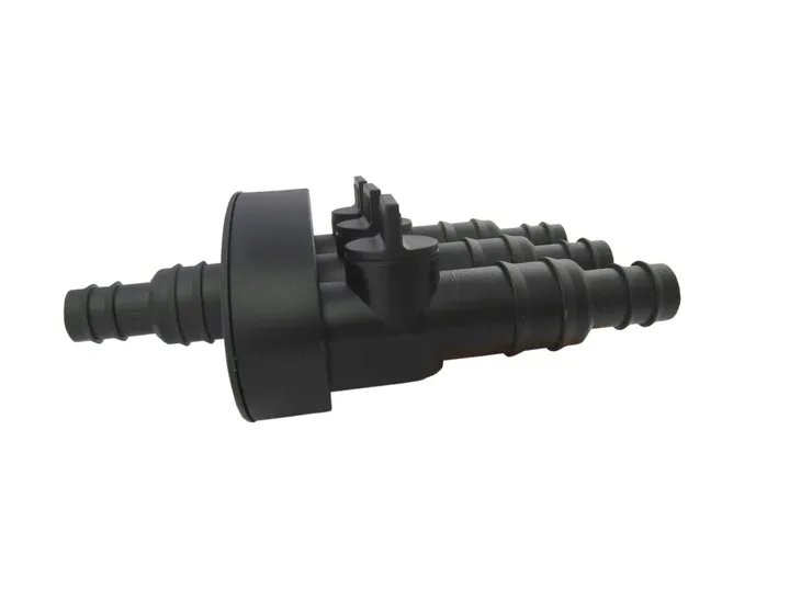 rozdzielacz wodny z trzema zaworami regulacyjnymi, pozwalającymi na regulację strumienia podawanej wody na figurę fontanny.