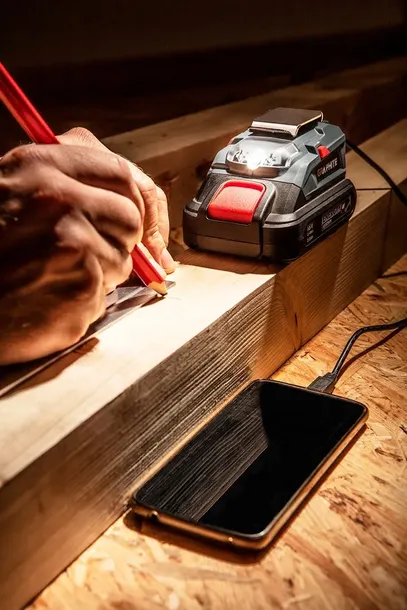 Adapter USB – latarka LED Energy to niewielkie urządzenie spełniające dwie funkcje. Po nałożeniu adaptera na dowolny akumulator Energy otrzymujemy do dyspozycji latarkę LED podświetlającą miejsce pracy. Druga funkcjonalność to Powerbank mogący służyć do zasilania lub ładowania urządzeń zewnętrznych poprzez gniazdo USB. Ładowanie urządzeń zewnętrznych, dla zwiększenia bezpieczeństwa użytkowania, kontrolowane jest modułem elektronicznym i po jego zakończeniu funkcja Powerbank przechodzi w tryb uśpienia. Dodatkowy metalowy klips pozwala na zamocowanie adaptera wraz z zamontowanym akumulatorem do paska.