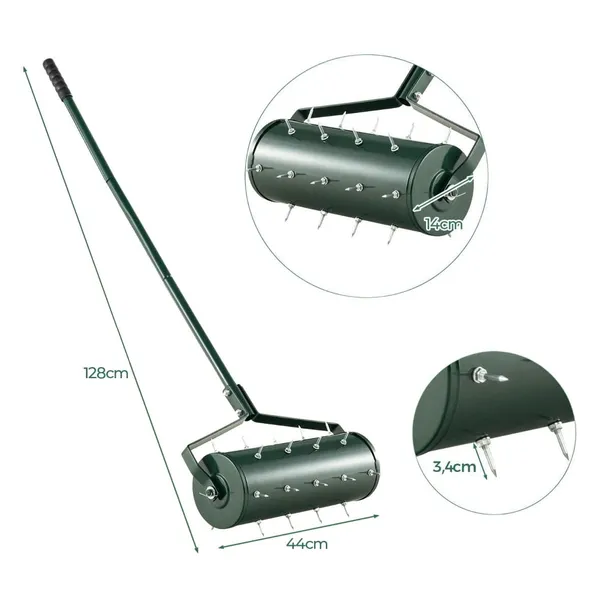 Poprawa kondycji trawnika: 44-centymetrowy walec jest wyposażony w 27 kolców ze stali nierdzewnej, które zapewniają idealne napowietrzania trawnika. Wbijane w glebę kolce umożliwiają roślinom lepsze wchłanianie wody, powietrza oraz składników odżywczych, co zapewnienia ich prawidłowy wzrost.