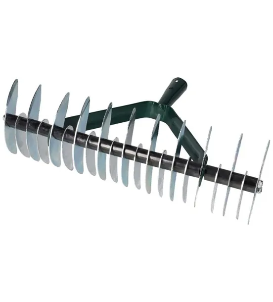 ▶ Produkt ten łączy w sobie funkcje aeratora i wertykulatora, co czyni go narzędziem wszechstronnym i niezastąpionym w ogrodzie oraz wokół domu. Aerator grabie posiada dwustronne zęby: z jednej strony są one zagęszczone i liczą 21 zębów, co idealnie nadaje się do wertykulacji, z drugiej strony zęby są rzadsze, liczące 11 zębów, co ułatwia aerację. Zęby wykonane są z ocynkowanej stali, co zapewnia ich trwałość i odporność na korozję. Każdy ząb ma grubość 1 mm oraz długość 6 cm. Szerokość głowicy wynosi 38 cm, co pozwala na efektywne napowietrzanie gleby na dużej powierzchni.