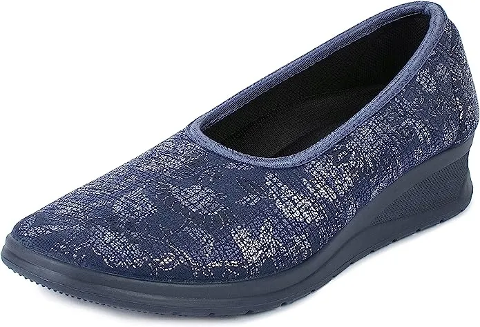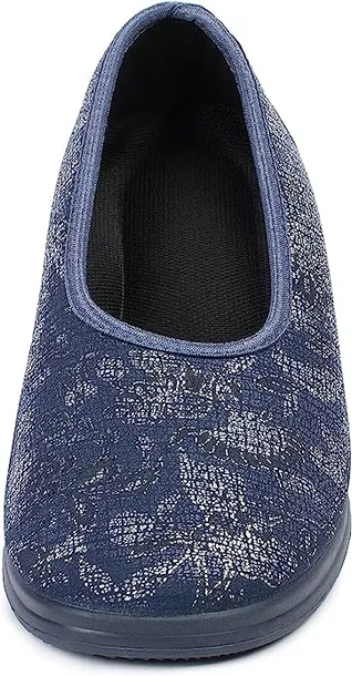Materiał wierzchni wykonano z wysokiej jakości tkaniny o atrakcyjnym, granatowym kolorze z delikatnym, dekoracyjnym wzorem. Tkaninowa wkładka jest przyjemna w dotyku, pozwala stopie oddychać i minimalizuje ryzyko otarć. Spód buta to solidna, gumowa podeszwa, która jest elastyczna i dobrze amortyzuje wstrząsy, co ma znaczenie szczególnie przy dłuższym chodzeniu.