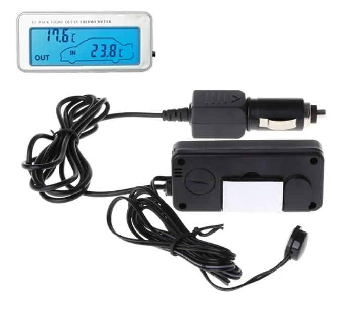 - Termometr posiada duży, czytelny wyświetlacz LCD z niebieskim podświetleniem(zasilanie z gniazda zapalniczki samochodowej) wyświetlającym jednocześnie temperaturę z dwóch czujników