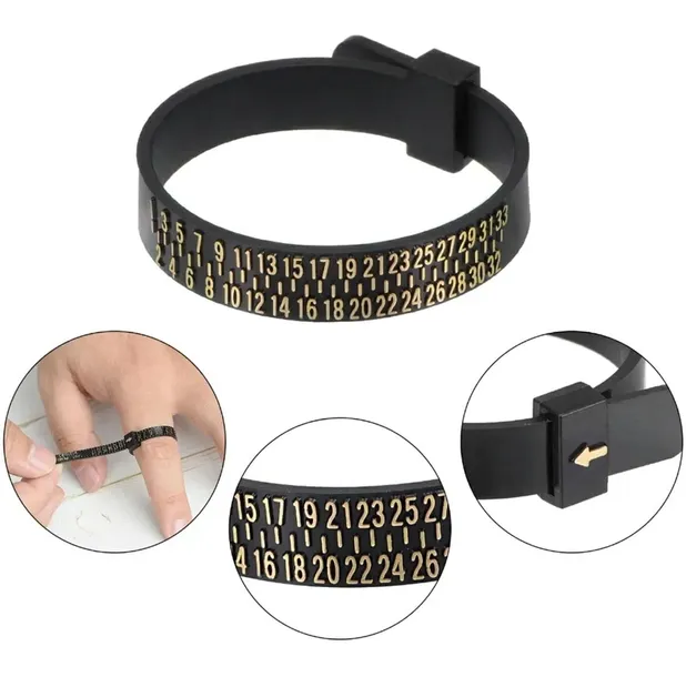 - Miarka jubilerska (multisizer) ułatwiająca ustalenie rozmiarów pierścionka i obrączki.
