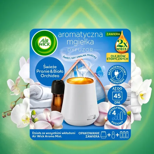 AIR WICK AROMATYCZNA MGIEŁKA O ZAPACHU ŚWIEŻE PRANIE & BIAŁA ORCHIDEA KOMPLET 20ML Z PODWOJONĄ ZAWARTOŚCIĄ OLEJKÓW ETERYCZNYCH*