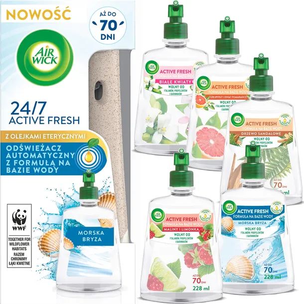 Poznaj nasz pierwszy** automatyczny odświeżacz powietrza z formułą na bazie wody, który dzięki użyciu unikalnym cząsteczkom, skutecznie neutralizuje brzydkie zapachy przez cały dzień. Air Wick 24/7 ACTIVE FRESH wypełni Twój dom zapachem aż do 70 dni*.