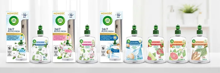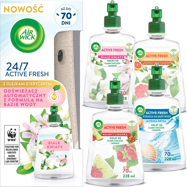 Poznaj nasz pierwszy** automatyczny odświeżacz powietrza z formułą na bazie wody, który dzięki użyciu unikalnym cząsteczkom, skutecznie neutralizuje brzydkie zapachy przez cały dzień. Air Wick 24/7 ACTIVE FRESH wypełni Twój dom zapachem aż do 70 dni*.