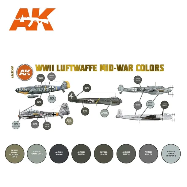 Zestaw farb akrylowych AK Interactive WWII Luftwaffe Mid-War Colors - kolory niemieckich samolotów z środkowego okresu II. w.ś.