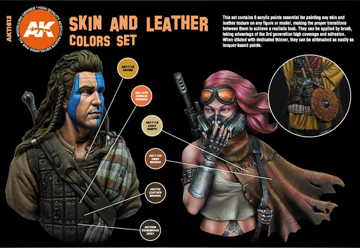 Zestaw zawiera 6 farb akrylowych niezbędnych do namalowania dowolnej skóry i tekstury skóry na dowolnej figurze lub modelu, wykonując odpowiednie przejścia między nimi, aby uzyskać realistyczny wygląd. Można je nakładać pędzlem, wykorzystując wysokie krycie i przyczepność trzeciej generacji. Po rozcieńczeniu dedykowanym rozcieńczalnikiem można je malować natryskowo tak łatwo, jak farby na bazie lakieru.