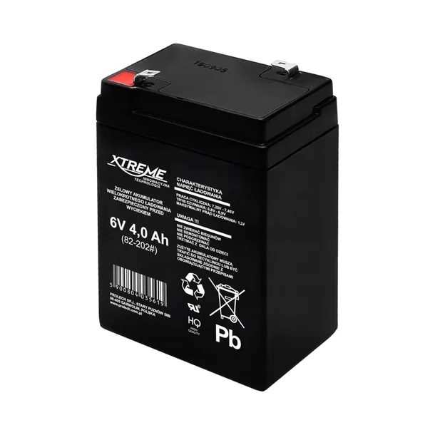 Napięcie: 6V Pojemność: 4,0 Ah Żywotność: ok. 5 lat Ładowanie(25 oC): użycie cykliczne: 7,2-7,5V(-15mV/oC), maksymalny prąd: 1,2 A użycie ciągłe: 6,8-6,9V(-10mV/oC) Wymiary i masa: