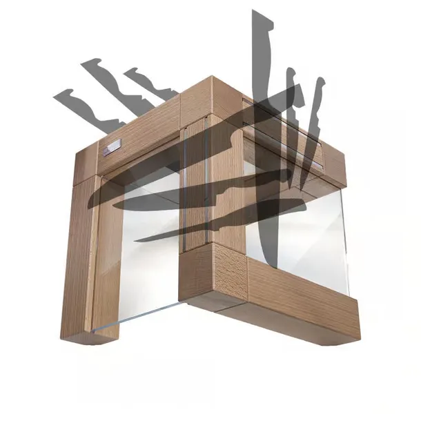 Stojak ma 3 moduły o długości 15 cm do przechowywania noży o długości ostrza do 24 cm. Wykonany jest z litego drewna bukowego oraz plexi i pokryty specjalnym lakierem dopuszczonym do kontaktu z żywnością.