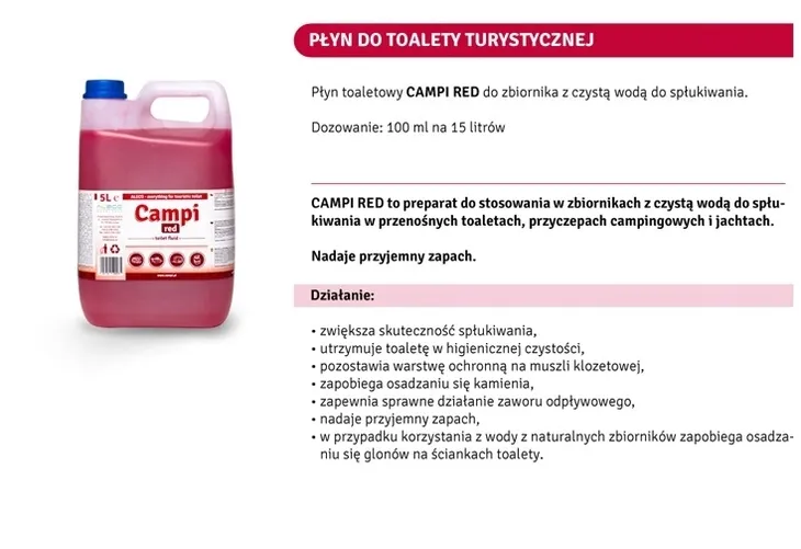 CAMPI RED preparat do stosowania w zbiornikach z czystą wodą do spłukiwania w przenośnych toaletach, przyczepach campingowych i jachtach.