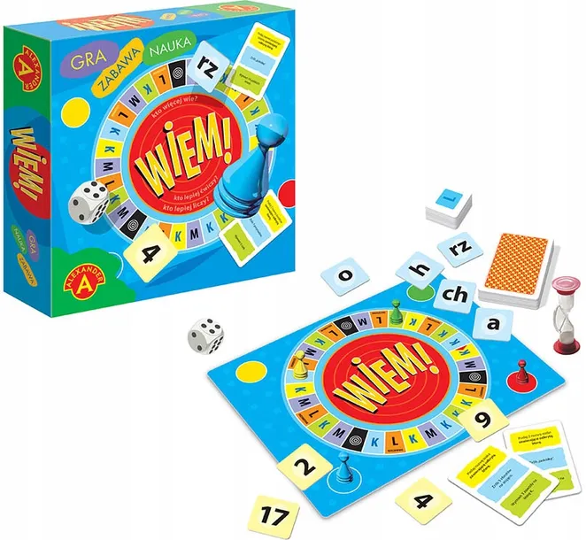 Jak zostać omnibusem? Sprawdź swoją wszechstronną wiedzę. Emocjonująca rywalizacja na informacje, umiejętność mnożenia, znajomość ortografii, sprawność fizyczną i zręczność manualną. Gracze przesuwając pionek po torze planszy wykonują zadania, które wyznacza każde z jej pól. Edukacyjny charakter gry łączy się z ćwiczeniami fizycznymi i zręcznościowymi, co gwarantuje dużo dobrej i wartościowej zabawy dla całej ść opakowaniaplansza, pionki - 4 szt., karty - 55 szt., tabliczki z literami - 35 szt., tabliczki z liczbami - 35 szt. , żetony - 40 szt. , klepsydra, katapulta, kulka, kubek, instrukcja.