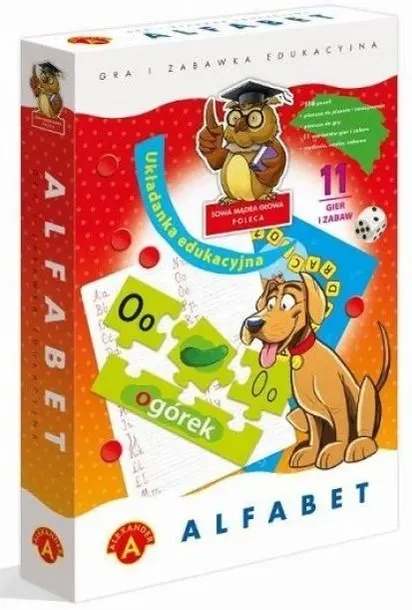 Zestaw 11 gier i zabaw mających na celu zaznajomienie dzieci z alfabetem poprzez zabawę. Pudełko zawiera 29 kompletów puzzli, składających się