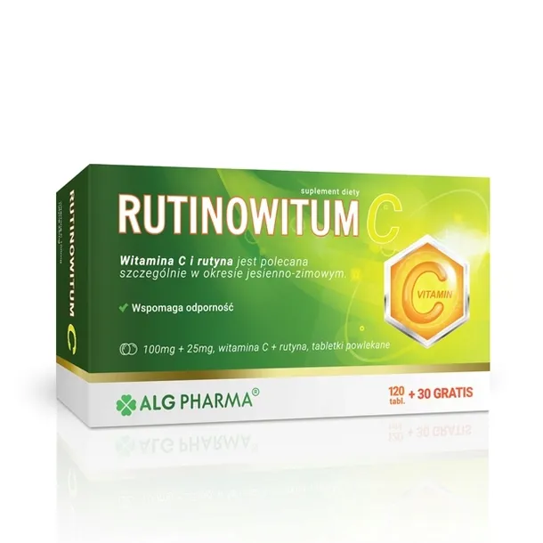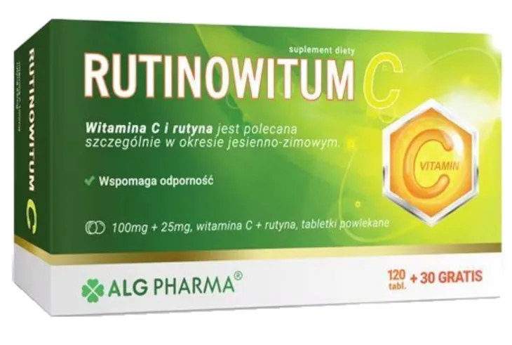 - description_extra1: |witamina C (kwas L-askorbinowy); substancja wypełniająca: celuloza mikrokrystaliczna; rutyna, substancje przeciwzbrylające: sole magnezowe kwasów tłuszczowych i dwutlenek krzemu, stabilizator: hydroksypropylometyloceluloza, substancja wypełniająca: polidekstroza, barwnik: dwutlenek tytanu, substancja glazurująca: glikol polietylenowy, substancja przeciwzbrylająca: talk, barwnik: ryboflawina.|Sposób użyciaZalecana porcja do spożycia w ciągu dnia niezbędna do uzyskania korzystnego działania: 1-2 tabletka dziennie po jedzeniu. W stanach niedoboru witaminy C: 1 do 2 tabletek 2 do 4 razy na dobę. (opakowanie zawiera 75 porcji). PrzeciwwskazaniaProdukt nie może być stosowany jako substytut zróżnicowanej diety. Zrównoważony sposób żywienia oraz zdrowy tryb życia są podstawą prawidłowego funkcjonowania organizmu. Nie należy przekraczać zalecanej porcji do spożycia w ciągu dnia. W przypadku stosowania leków lub innych suplementów diety należy skonsultować z lekarzem. PrzechowywaniePrzechowywać w temperaturze pokojowej. Chronić przed wilgocią. Przechowywać w sposób niedostępny dla małych dzieci.|Podmiot odpowiedzialny:ALG Pharma Sp. z o. o. ul. Marcina Kasprzaka 31, 01-234 Warszawa NIP: 5272715595 REGON 147287080