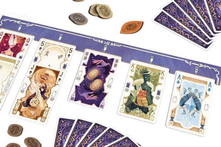 Zawartość opakowania: • 54 karty, • 5 kart pomocy, • 5 żetonów przewidywania, • 50 run, • 4 fragmenty toru.