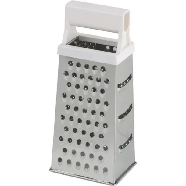 Poręczna tartka z różnymi wielkościami oczek na każdym z boków. Wykonana ze stali nierdzewnej z rączką z plastiku.