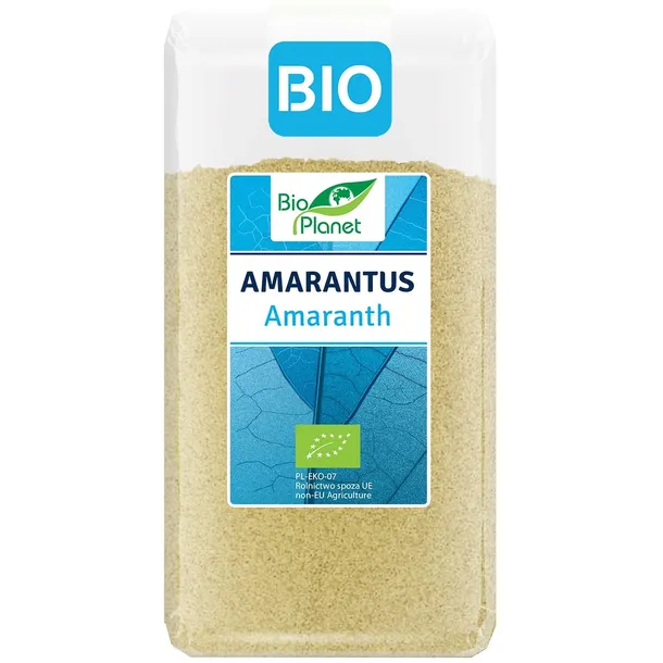 SKŁADNIKIekologiczny amarantus 100 %. OPISEkologiczny amarantus jest jedną z najstarszych i najbardziej pożywnych roślin (pseudozbóż) uprawianych na świecie. Doskonały do porannej owsianki, do pieczenia chleba, ciast, zup i dań zbożowych.SPOSÓB PRZYGOTOWANIAuprzednio wypłukane na gęstym sicie ziarno amarantusa gotować w proporcji 1:2 (1 porcja amarantusa na 2 porcje wody) ok. 20 minut.WARTOŚĆ ODŻYWCZA W 100 gWartość energetyczna 1556 kJ/369 kcalTłuszcz 7,0 gw tym kwasy tłuszczowe nasycone 1,0 gWęglowodany 59 gw tym cukry 2,0 gBłonnik 7,0 gBiałko 14 gSól 0,01 g ZALECANE WARUNKI PRZECHOWYWANIAPrzechowywać w suchym i chłodnym miejscu.