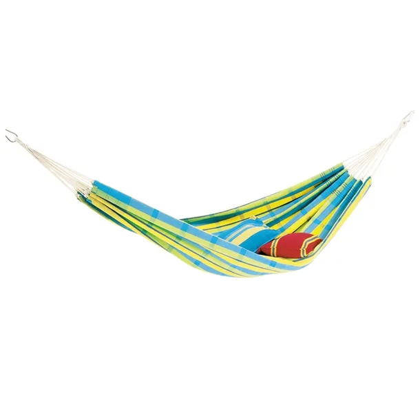 Z Brazylii, ojczyzny sjesty i celebrowania wypoczynku, pochodzi ten cudowny hamak. Jest bardzo duży i wygodny, dzięki maksymalnemu obciążeniu jest w stanie pomieścić więcej niż jedną dorosłą osobę! Charakteryzuje się wysoką jakością: zawartość bawełny 85%, poliestru: 15%, przez co jest niezwykle miły i komfortowy. Hamak można zawiesić na dwa możliwe sposoby: - hamak do zawieszenia na drzewie (mocowanie na linie Amazonas Smartrope) - hamak do zawieszenia na stelażu Akcesoria do zawieszenia hamaka(nie są w zestawie z huśtawką). Wykorzystanie szczególnie grubego materiału o gramaturze 400g/m2 oraz wykończenie go poczwórnym szwem gwarantują najwyższą jakość i wytrzymałość hamaka. Hamak pakowany jest w piękny worek wykonany z tego samego materiału co dany model. Polecamy montowanie hamaków Barbados na stelażach/stojakach Arcus, Troja, Olymp, Madera, Sumo Grande. Do zawieszenia hamaka na drzewie polecamy linę Amazonas Smartrope. Parametry techniczne : * Skład: 85% bawełna, 15% poliester * Powierzchnia siedzenia : około 230 x 150 cm * Długość całkowita : około 340 cm * Waga produktu : około 1,8 kg * Maksymalne obciążenie : około 200 kg