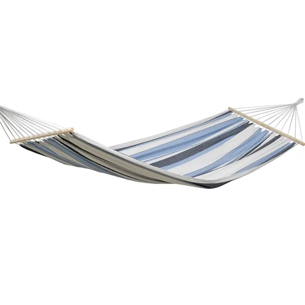 Samba to tradycyjny, komfortowy hamak z poprzeczkami do ogrodu lub na taras! Dzięki specjalnej tkaninie EllTex jest odporny na szkodliwe promienie UV oraz niesprzyjające warunki pogodowe a przy tym jest tak miły w dotyku jak bawełna. Hamak można zawiesić na trzy możliwe sposoby: - hamak do zawieszenia na drzewie (mocowanie na linie Amazonas Smartrope) - hamak do zawieszenia o scianę (mocowanie na hakach Easy+) - hamak do zawieszenia na stelażu Akcesoria do zawieszenia hamaka (nie są w zestawie z hamakiem): - Lina Amazonas Smartrope - Hak Amazonas Easy+ Polecamy montowanie hamaków SAMBA na stelażach Olymp i Sumo Rockstone. Samba pakowana jest w piękny worek wykonany z tego samego materiału co hamak. Parametry techniczne : * Skład: 100% bawełna * Powierzchnia siedzenia : około 210 x 140 cm * Długość całkowita : 310 cm * Waga produktu : około 2,3 kg * Maksymalne obciążenie : około 150 kg