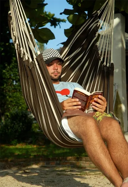 Z Brazylii, ojczyzny sjesty i celebrowania wypoczynku, pochodzi ten cudowny wiszący fotel. Przy iście królewskich wymiarach 1,30 m szerokości i 1,60 m długości, Brasil jest prawie tak duży jak klasyczny brazylijski hamak. Ten fotel hamakowy tkany w Brazylii jest cudownie miły dzięki bardzo wysokiej zawartości bawełny w składzie: 85% bawełny i 15% poliestru. Zastosowanie: - wiszący fotel do salonu (mocowanie na haku Power Hook lub na jednym ze stojaków) - fotel do karmienia (Power Hook lub stojak Luna lub Palmera) - huśtawka ogrodowa lub na taras / balkon - fotel wiszący do powieszenia na drzewie (za pomocą liny Smartrope) Wykorzystanie szczególnie grubego materiału o gramaturze 400g/m2 oraz wykończenie go poczwórnym szwem gwarantują najwyższą jakość i wytrzymałość huśtawki. Brasil zawieszony jest na drewnianym drążku o długości 1,10 m i grubości 44mm, wykonanym przy użyciu opatentowanej techniki Drexelung ( końce są lżejsze od środka), co zapewnia stabilny naciąg lin oraz zapobiega ich ześlizgiwaniu się w kierunku środka. Idealnym dodatkiem do huśtawki Brasil jest Footrest - Podnóżek zapewniający komfortowe ułożenie stóp! Po prostu zawieś na drewnianym drążku od Twojego wiszącego fotela Brasil i poczuj się jak w niebie. Dla większego bezpieczeństwa: Zawsze zawieszaj sznurki huśtawki w wewnętrznych zagłębieniach drążka, a linki, na których fotel wisi w zewnętrznych zagłębieniach. Polecamy montowanie huśtawki Brasil: - za pomocą stojaka Palmera / Luna - za pomocą haka Power Hook marki Amazonas - lub z liną do hamaków i huśtawek Smartrope Parametry techniczne: * Skład: 85% bawełna, 15% poliester * Powierzchnia siedzenia: 160 x 130 cm * Długość drążka: ok. 110 cm * Waga produktu: ok. 2,7 kg * Maksymalne obciążenie: 150 kg * Rekomendowana wysokość zawieszenia: przynajmniej 210 cm * Rekomendowana odległość od podłoża: 40 - 50 cm