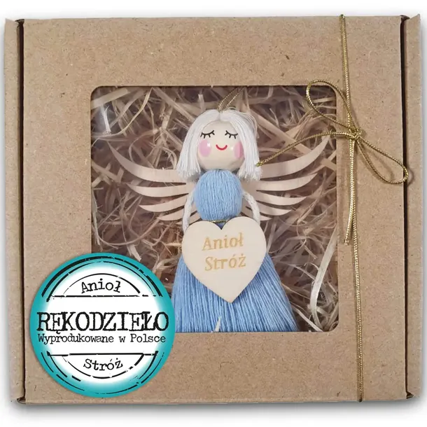 Rękodzieło wyprodukowane w Polsce. Figurka anioła o wymiarach 10.0 x 7.0 cm, ułożona na wełnie drzewnej, całość zapakowana w ekologiczne pudełeczko z okienkiem opasane złotym sznureczkiem.