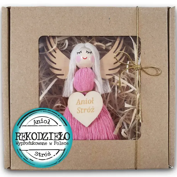 Rękodzieło wyprodukowane w Polsce. Figurka anioła o wymiarach 10.0 x 7.0 cm, ułożona na wełnie drzewnej, całość zapakowana w ekologiczne pudełeczko z okienkiem opasane złotym sznureczkiem.