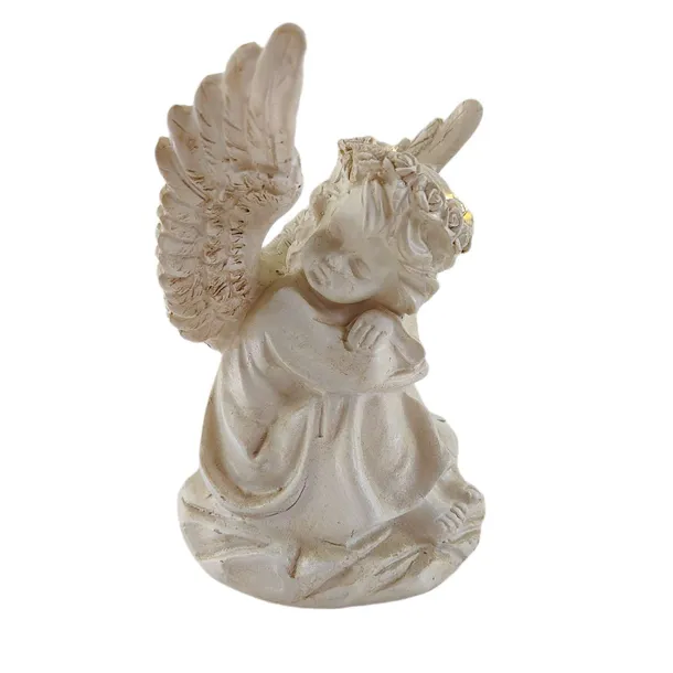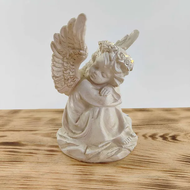 Figurka siedzącego aniołka solarnego ze świecącym wiankiem w kolorze białym ciepłym.