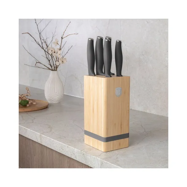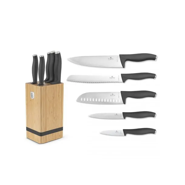 6 elementowy zestaw noży bloku bambusowym firmy BERLINGER HAUS z serii Antracit. Przeznaczone do porcjowania mięsa i ryb, krojenia pieczywa oraz obierania i siekania warzyw. Noże wykonane wysokiej jakości stali nierdzewnej Ferrinox 18/10 o wysokiej zawartości węgla 1.4028/X30Cr13. Istotną cechą tej stali jest fakt, że jest odporna na wszelkiego rodzaju zadrapania, zarysowania, charakteryzuje się zwiększoną odpornością na ścieranie i korozję. Wyposażone w uchwyty pokryte bardzo trwałą cienką warstwą silikonu dla uzyskania pewnego trzymania w każdych warunkach. Noże drewnianym bambusowym bloku. Całość stanowi niebanalny element dekoracyjny w każdej kuchni. Zestaw zawiera wszystkie niezbędne noże do codziennego przygotowywania posiłków.W zestawie: