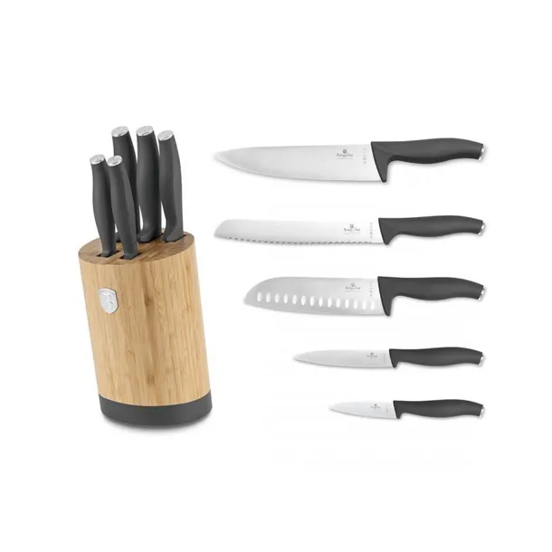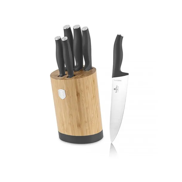 6 elementowy zestaw noży bloku bambusowym firmy BERLINGER HAUS z serii Antracit. Przeznaczone do porcjowania mięsa i ryb, krojenia pieczywa oraz obierania i siekania warzyw. Noże wykonane wysokiej jakości stali nierdzewnej Ferrinox 18/10 o wysokiej zawartości węgla 1.4028/X30Cr13. Istotną cechą tej stali jest fakt, że jest odporna na wszelkiego rodzaju zadrapania, zarysowania, charakteryzuje się zwiększoną odpornością na ścieranie i korozję. Wyposażone w uchwyty pokryte bardzo trwałą cienką warstwą silikonu dla uzyskania pewnego trzymania w każdych warunkach. Noże drewnianym bambusowym bloku. Całość stanowi niebanalny element dekoracyjny w każdej kuchni. Zestaw zawiera wszystkie niezbędne noże do codziennego przygotowywania posiłków.W zestawie: