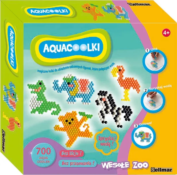 Aquacoolki to zestaw 700 kolorowych koralików (7 kolorów po 100szt) do tworzenia różnych modeli poprzez ułożenie ich wg szablonu i spryskanie wodą. Zestaw ten zawiera szablony ze zwierzątkami z zagrody .