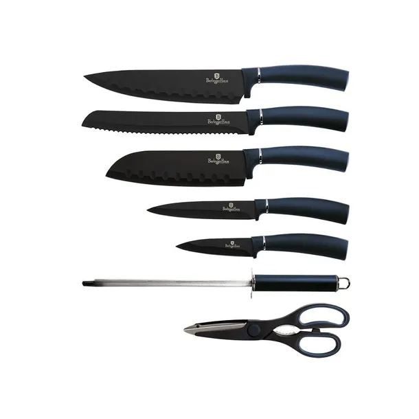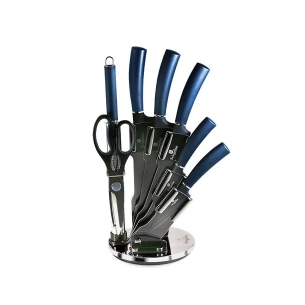 8 elementowy zestaw noży na stojaku firmy BERLINGER HAUS z serii Aquamarine. Przeznaczone do porcjowania mięsa i ryb, krojenia pieczywa oraz obierania i siekania warzyw. Noże ze stali nierdzewnej dodatkowo pokryte powłoką nieprzywierającą non-stick. Wyposażone w uchwyty pokryte bardzo trwałą cienką warstwą silikonu dla uzyskania pewnego trzymania w każdych warunkach.