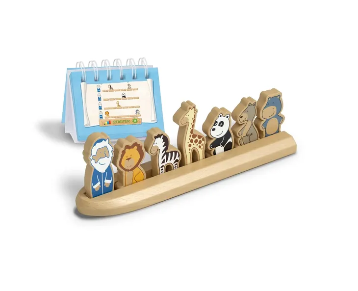 Logiczne wyzwanie na pokładzie Arki Noego! Wszystkie zwierzęta gromadzą się na Arce Noego, aby uciec przed wielkim potopem. Jedynym pytaniem jest, jak je zorganizować w taki sposób, by wszystkie zmieściły się na pokładzie i były bezpieczne? Otwórz książeczkę z zadaniami i zapoznaj się ze wskazówkami wybranego wyzwania. Na ich podstawie ustaw drewniane zwierzęta na łodzi. Sprawdź czy układ jest zgodny z prawidłowym rozwiązaniem.